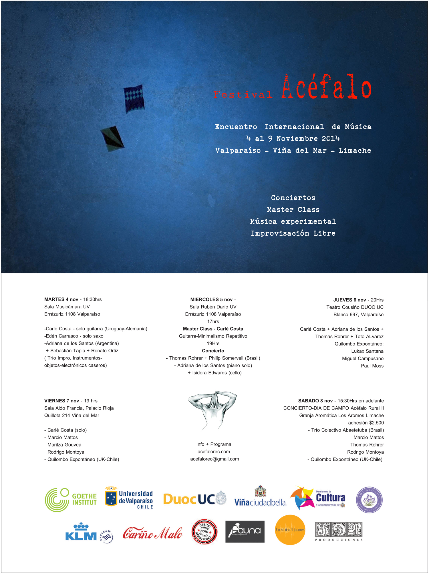 Este año Festival Acèfalo se desarrollará entre el 4 y 9 de Noviembre. Con artistas de Reino Unido, Brasil, Argentina, Uruguay, Alemania y Chile .En esta versión se reúne un amplio espectro de músicos que transitan entre la experimentación , el minimalismo, ruido y todo en esta maquinaria de intensa creación y vértigo musical que crea la Improvisación Libre.